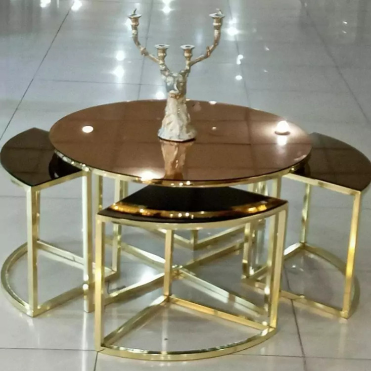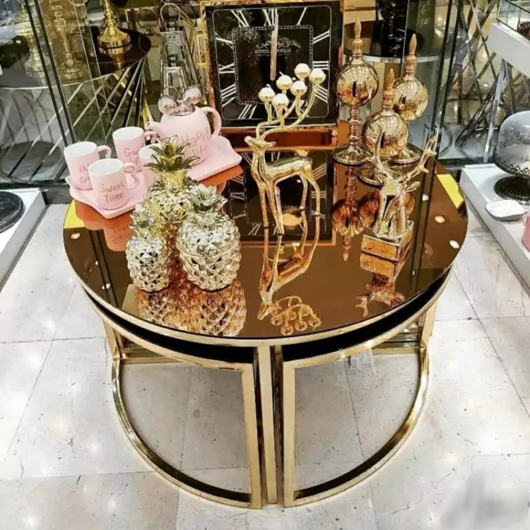میز جلو مبلی عسلی قهوه خوری پاف مدل پیتزایی گرد فورتیک طلایی بدنه از جنس پروفیل آهنی آبکاری فورتیک طلایی صفحه شیشه دودی و برنز و یا چوب ام دی اف با روکش وکیوم هایگلاس